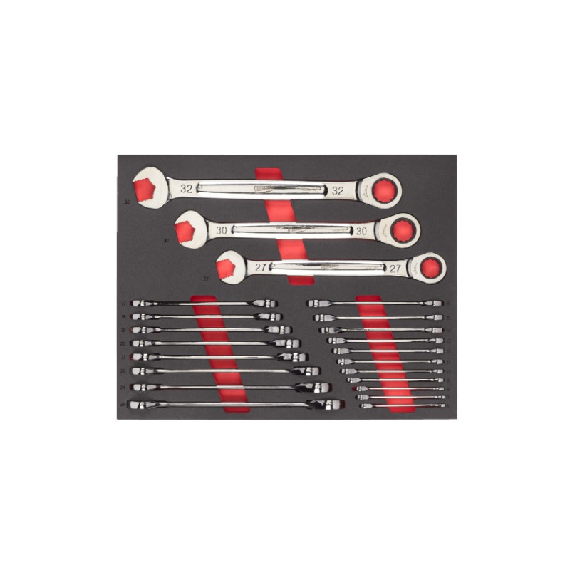 Ложемент з ключами метричними хромованими рожково-накидними MAX BITE MILWAUKEE з храповиком, (22шт) (45х536х417мм) для візків