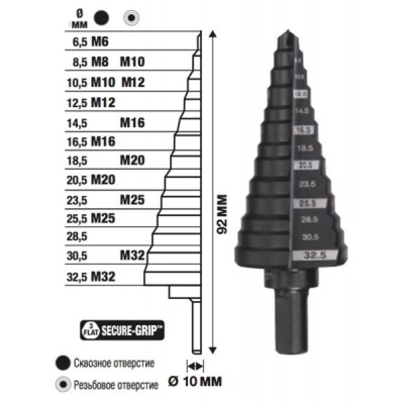 Ступінчасте свердло M6-M32 (1 шт) Свердління - розширення - зенкування - все в одному Наконечник швидко засвердлюється - немає необхідності кернити або заздалегідь засвердлювати матеріал Спеціальний наконечник і геометрія ступінчастого свердла - зменшує ризик закушування свердла при використанні високошвидкісних акумуляторних дрилів і захищає матеріал від деформації. Оптимізована геометрія з двома канавками та гострими кромками забезпечує в 2 рази більшу швидкість та акуратність різу Виготовляються із спеціально розробленої сталі з чорним оксидним покриттям, що збільшує ресурс свердла до 4 разів. Оптимальні для використання з високошвидкісними акумуляторними інструментами Маркування розмірів нанесено лазером для видимості весь термін служби свердла Кожен ступінь свердла має рельєф, який автоматично знімає задирки. Тригранний хвостовик запобігає провороту свердла в патроні і забезпечує максимальну передачу моменту, що крутить. Один східчастий свердло Step Drill 4-12/1 мм для свердління кількох розмірів у сталі та пластиці з більшою точністю та меншою кількістю операцій Матеріали придатні для роботи зі східчастими свердлами Milwaukee Step Drill: Чорні та кольорові метали, листи профілі та труби, мідь, латунь та алюміній, нержавіюча сталь, пластмаси Для збільшення терміну служби свердла Step Drill 4-12/1 мм рекомендується під час роботи використовувати охолоджувальні рідини